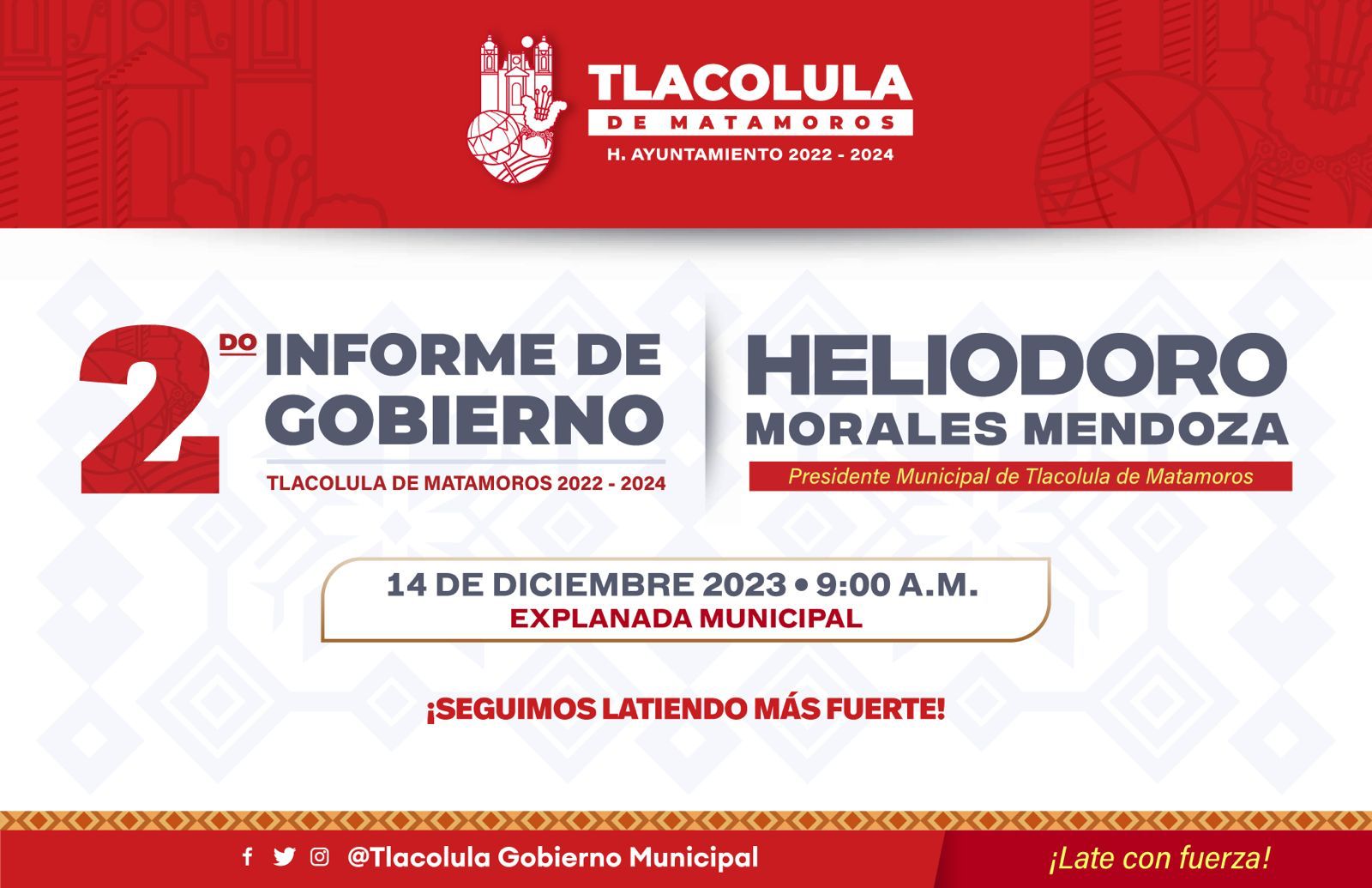 Tlacolula de Matamoros, Oaxaca, 7 de diciembre de 2023.- La administración municipal 2022-2024, anunció que será el próximo jueves 14 de diciembre, a las 9:00 hrs. cuando Heliodoro Morales Mendoza, rinda su segundo informe de gobierno, en un acto que se efectuará en la explanada del palacio municipal.