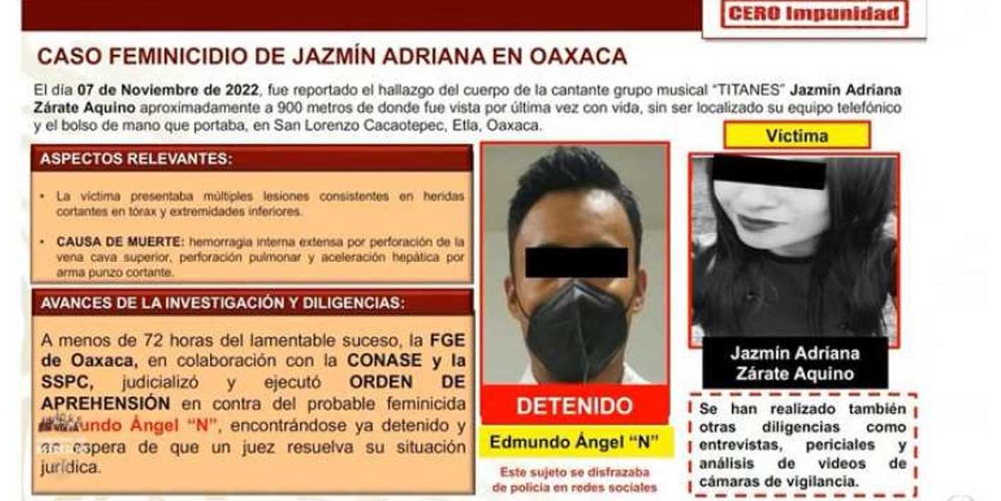 La aprehensión del probable feminicida se dio tras un arduo trabajo de inteligencia encabezado por el Grupo de Delitos Sexuales adscrito a la Unidad de Género de la Vicefiscalía General Zona Centro, en colaboración con las Fiscalías Locales de Ocotlán, Etla y del grupo Fuerza Especial de Reacción Inmediata (FERI), así como de elementos de la Agencia Estatal de Investigaciones (AEI), peritos y Agentes del Ministerio Público de la FGEO.