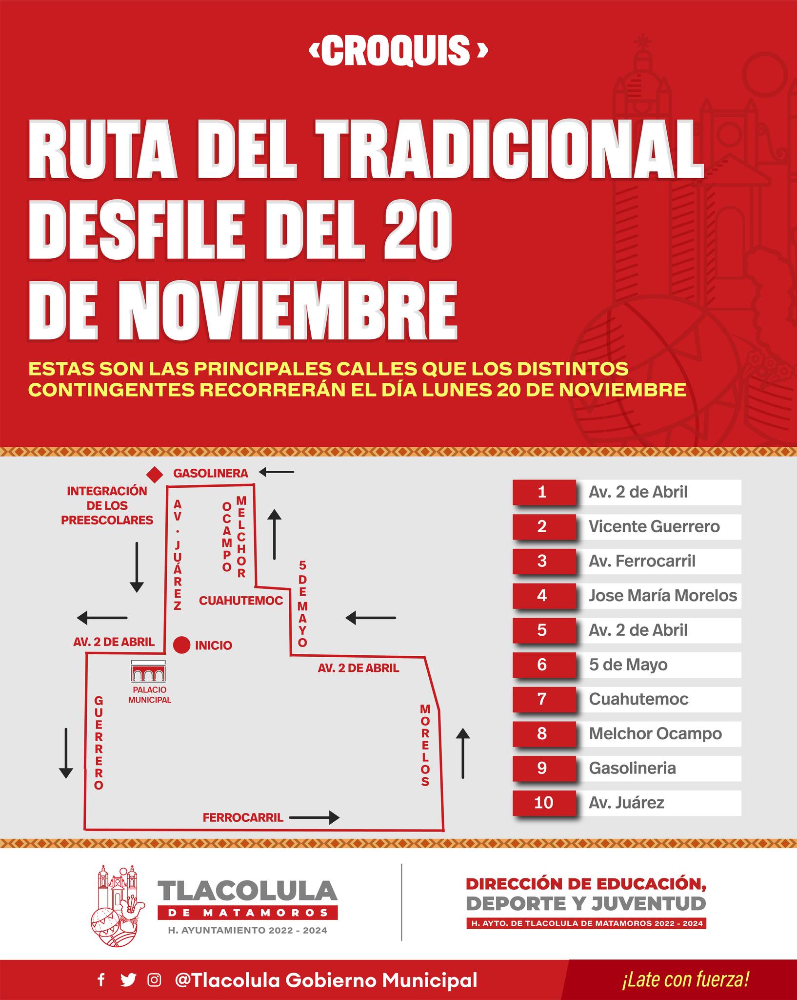 TLACOLULA DE MATAMOROS, Oaxaca, 19 de noviembre de 2023.-Al tiempo que daba a conocer el recorrido del desfile conmemorativo del 20 de noviembre, la administración municipal que encabeza Heliodoro Morales Mendoza, informó que el evento se llevará a cabo de manera normal como cada año.