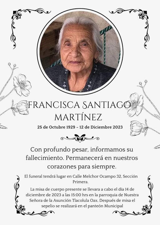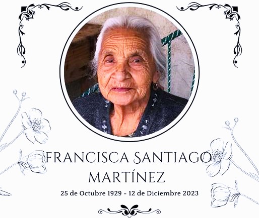 TLACOLULA DE MATAMOROS, Oaxaca, 14 de diciembre de 2023.- El pasado martes, a la edad de 94 años falleció doña Francisca Santiago Martínez y sus restos mortales, serán sepultados este día por la tarde en el panteón municipal.