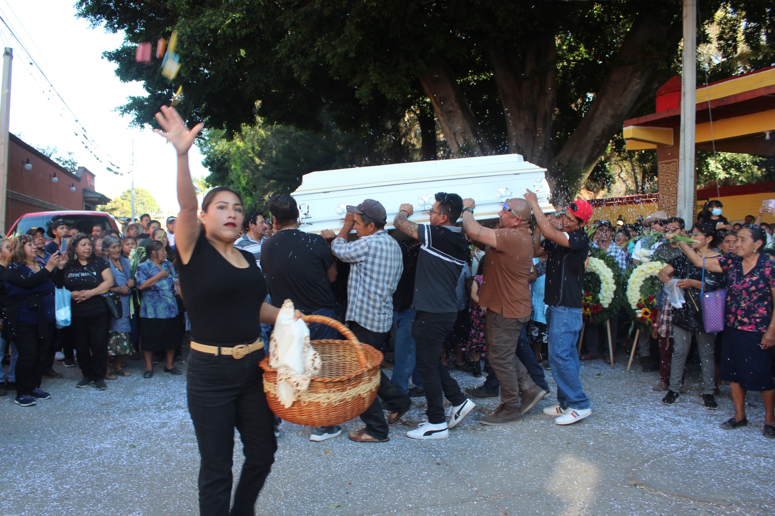 TLACOLULA DE MATAMOROS, Oaxaca, 10 de febrero de 2024.-Con gritos de “Chaparro, chaparro, chaparro”, como cariñosamente se le conocía, un enorme número de asistentes despidieron a José Alfredo Jiménez Aquino, mientras familiares, amigos y compañeros, lo “bailaban” al compás del jarabe del Valle y la tradicional -pero a la vez dolorosa- “canastita”, en frente de la entrada principal del panteón municipal, de esta ciudad.