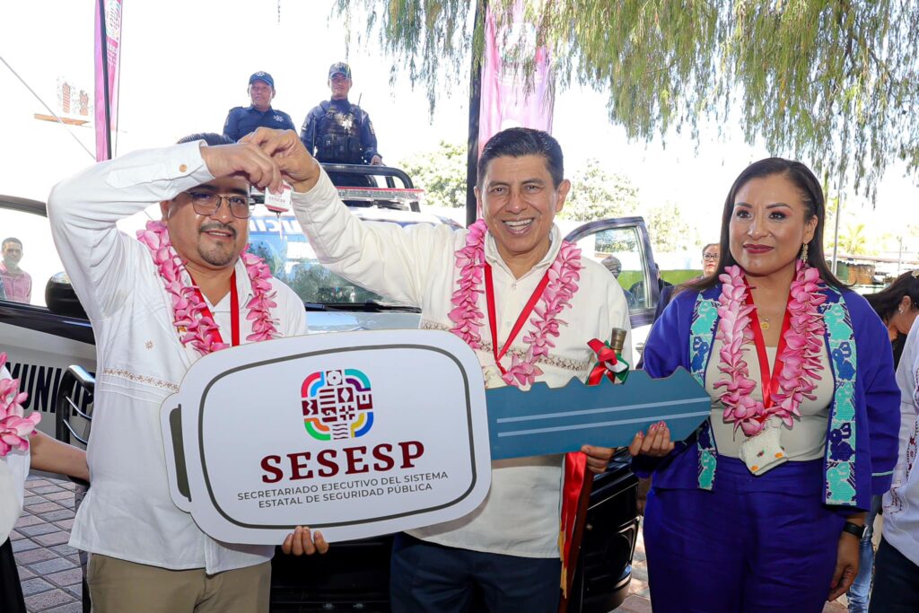 Aquí, se hizo entrega de una patrulla para el fortalecimiento del sistema de seguridad y se informó que se está invirtiendo en certificación de policías; abasto de medicamentos e insumos para unidades de salud; infraestructura y equipamiento escolar; programas sociales y de alimentación; equipamiento de estancias de día y club de adultos mayores; apoyo con aparatos funcionales; y alumbrado público.