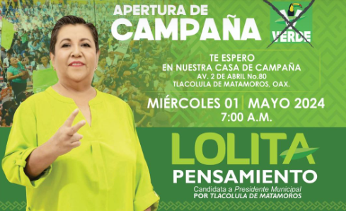 TLACOLULA DE MATAMOROS, Oaxaca, 1 de mayo de 2024.-A través de su cuenta de Facebook, Lolita Pensamiento, invitó a la apertura de campaña que le permita llegar a la presidencia municipal de Tlacolula, bajo las siglas del PVEC (Partido Verde Ecologista de México).