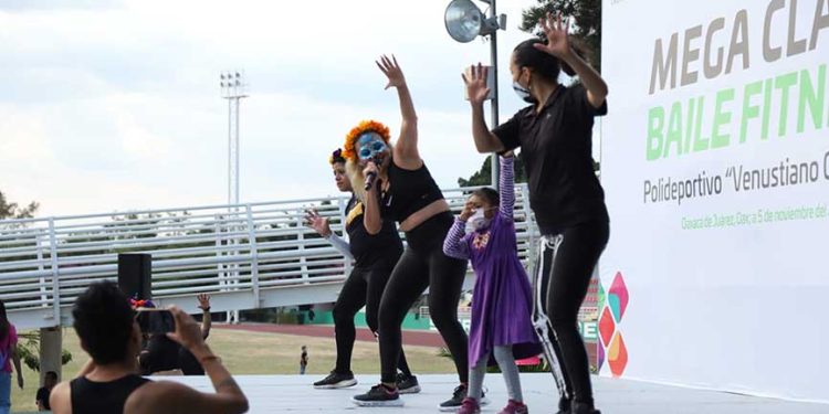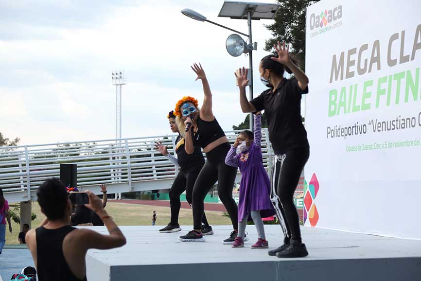 Tlalixtac de Cabrera, Oax. 18 de noviembre de 2022.- Familias oaxaqueñas se reunieron en el Polideportivo Venustiano Carranza para disfrutar una tarde de baile, diversión, entretenimiento y sana convivencia con la Mega Clase Fitness que llevó a cabo la Secretaría de Administración, a iniciativa de su titular, Marina Nassar Piñeyro.