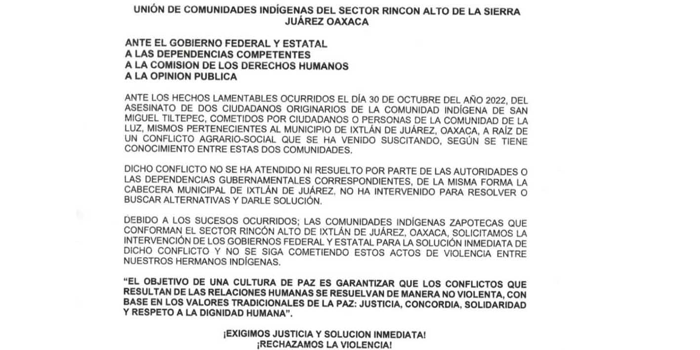 Pronunciamiento de la Unión de Comunidades Indígenas del Sector Rincón Alto de la Sierra Juárez Oaxaca